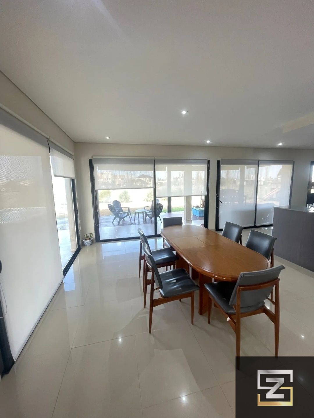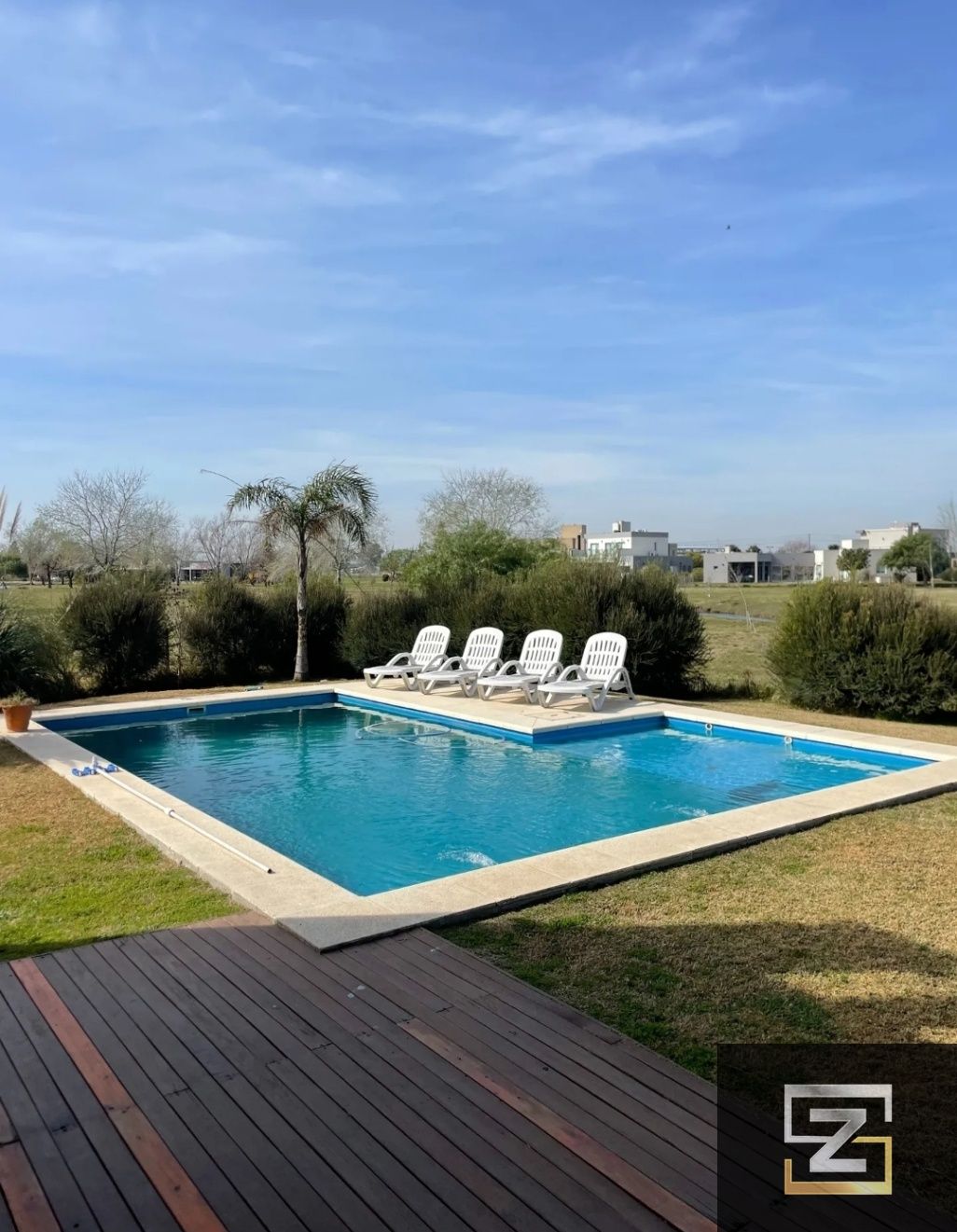 Los exteriores cuentan con espacio lateral cubierto para el guardado de 2 autos, baño completo con ducha, una amplia galería semicubierta, parrilla, , pileta climatizada, sector de juegos infantiles, riego automatizado y cerco vivo. En el fondo encontramos una salida independiente por tranquera al rio del barrio, el cual conecta las dos lagunas del mismo junto a un gran pulmón verde.